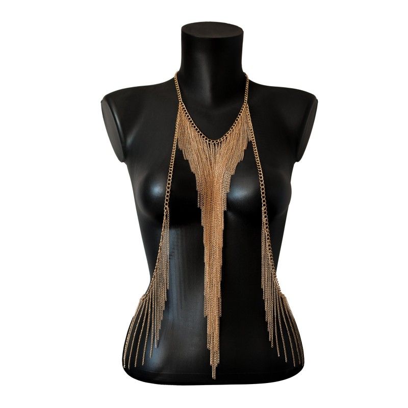 Producto: Body Chain Color ES: Dorado Cierre trasero ES: Abierto en la espalda Cuello ES: De pico Tipo de corte ES: Medio (Hasta gluteos) Tela ES: Metal Detalles ES: Sin detalles adicionales Total piezas ES: 1 Composición ES: Metal Etiquetaje ES: Etiqueta estandar Embalaje ES: Bolsa plástico serigrafiada con logotipo
