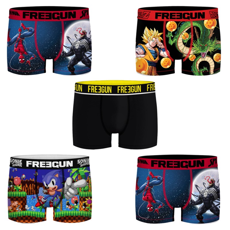 Set surtido de 5 boxers aleatorios en talla INFANTIL de la marca FREEGUN Composición: entre 95% algodón 5% elastano ó 92% poliéster 8% elastano Boxers fabricados en poliéster: Ajuste, comodidad y durabilidad, proporcionando ligereza y con la resistencia y elasticidad de las fibras sintéticas. Boxers fabricados en algodón: hipoalergénico, libre de químicos, transpirabilidad y durabilidad. El elastano le proporciona la ajustabilidad necesaria. En su caso, la impresión es por sublimación: los colores del diseño se funden con el tejido, por lo que no se desvanecerán. Máxima protección y un comodidad óptima, con tejido suave. Con costuras planas para un perfecto confort. Cinturas elásticas con logo impreso. Disponen de forro 100% algodón.