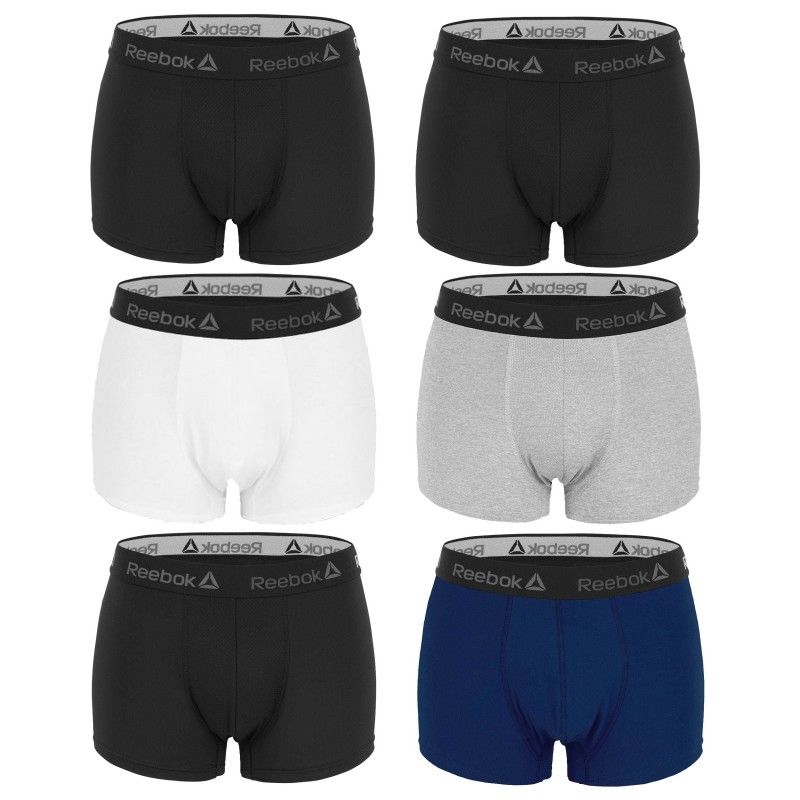 Boxers REEBOK - 6 piezas surtidas. Fabricados en 95% algodón 5% elastano Color multi: Body: 3negro/1blanco/1gris/1azul Cintura: negro Boxers fabricados en algodón: hipoalergénico, libre de químicos, transpirabilidad y durabilidad. El elastano le proporciona la ajustabilidad necesaria. Los colores del diseño se funden con el tejido, por lo que no se desvanecerán. Máxima protección y un comodidad óptima, con la suavidad del algodón. Con costuras planas para un perfecto confort. Cinturas elásticas con logo impreso. Dispone de forro 100% algodón. Vienen empaquetados en box con percha.