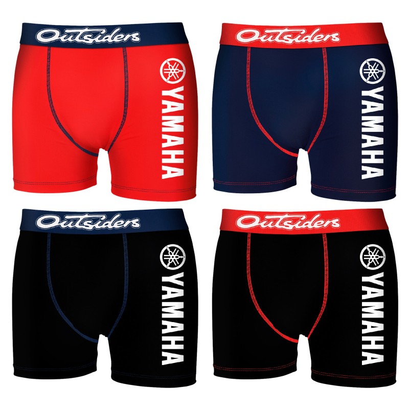 Set de 4 calzoncillos tipo boxer lisos de la marca YAMAHA. Colección Outsiders. Se compone de los siguientes modelos: 1x Color rojo con cintura en azul 1x Color azul con cintura en rojo 1x Color negro con cintura en azul 1x Color negro con cintura en rojo