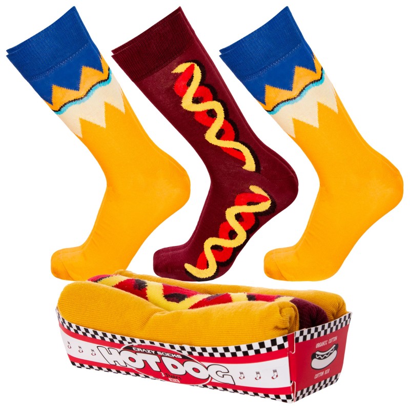 Calcetines de vestir Crazy socks, en pack de 3 pares, con divertidos diseños, y en una original caja, ideal para regalo: amigo invisible, navidades... Además de los increíbles diseños, estos calcetines tienen una cualidad excepcional: están FABRICADOS EN ALGODÓN BIOlógico. ¿Qué significa esto? Que tanto en su cultivo (en tierras libres de pesticidas, herbicidas y fertilizantes químicos) como en su procesamiento se realiza sin químicos tóxicos: por tanto, no solo tiene mejor calidad, disminuyendo la posibilidad de reacciones alérgicas, la piel transpira mejor, sino que también es mejor para el medio ambiente. El algodón BIO es más suave que el algodón común, no hay posilidad de que sea transgénico, y no genera residuos tóxicos, propiciando un respeto al productor, su entorno, y a tí como consumidor: propicia un compromiso social y medioambiental. Punta y talón reforzado, y caña con elástico para mejor sujección.