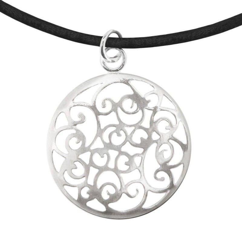 COLGANTE FILIGRANA COLOR PLATA CON CORDON CUERO NEGRO