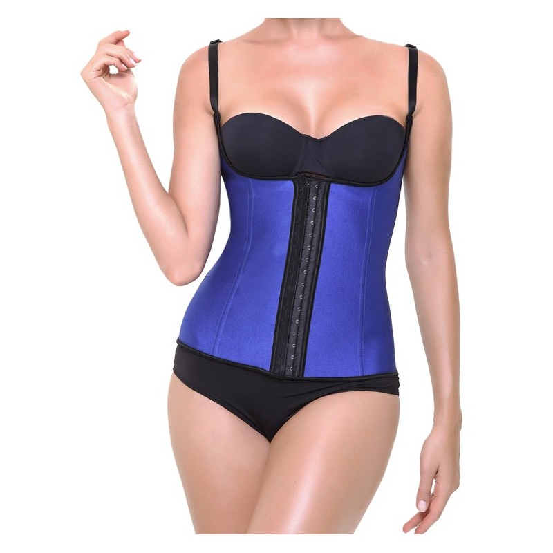 Producto: Corset Color: Azul Varillas: Metálicas de acero inox trenzado Cierre trasero: Sin cierre Cierre delantero: Ballenas metálicas de acero inoxidable en la parte frontal Con corchetes Cuello: Sin escote Copa: Sin copa Aros: Sin aros Tipo de corte: Corto (Hasta la cadera) Tirantes: Tirantes regulables Tela: Lisa Detalles: Otros como se ve en la foto Total piezas: 1 Composición: Forro: Algodón 96% Spandex 4% Exterior: Látex 100% Etiquetaje: Etiqueta estandar Embalaje: Bolsa plástico transparente