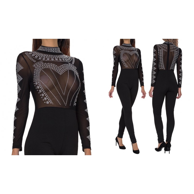 Producto: Mono Color: Negro Cierre trasero: Cremallera Cierre delantero: Sin cierres Cuello: Sin escote Tipo de corte: Sin corte( Hasta los pies) Tirantes: Sin tirantes Tela: Lisa Detalles: Pedrería Strass Accesorios: Tanga Total piezas: 1 Composición: 95% polyester - 5% spandex Etiquetaje: Etiqueta estandar Embalaje: Bolsa plástico transparente