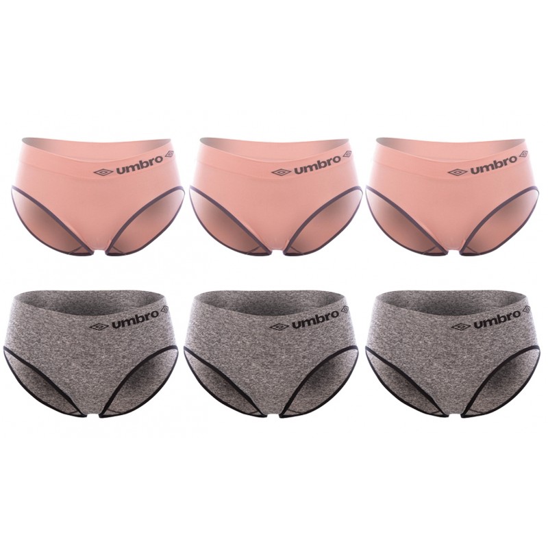 Set 6 Slips deportivos femenino de la marca UMBRO Composición: 70% Poliamida 20% Poliéster 10% Elastano En color negro (x2), gris (x2) y rosa (x2) Fabricado sin costuras, para mayor comodidad Talla S/M